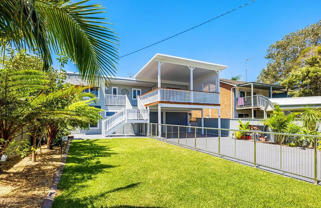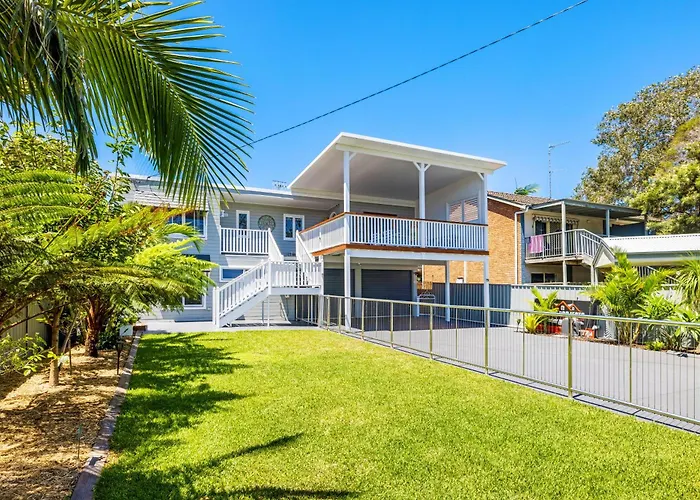 Situata a 2 km dal Monte Tomaree, la Shoaly House And Shoaly House Cottage - Perfect For Multiple Families & Wedding Groups Shoal Bay, dispone di una terrazza con vista sul giardino.